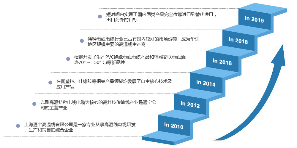 上海通宇高溫線有限公司通過多年的發(fā)展和奮斗,上海通宇以其管理創(chuàng)新與技術(shù)發(fā)展并重的鮮明特征,在通宇人的努力下建立了中國目前具有競爭力的高溫線生產(chǎn)基地。在短時(shí)間內(nèi)實(shí)現(xiàn)了國內(nèi)同類產(chǎn)品依靠進(jìn)口到替代進(jìn)口,出口海外的目標(biāo)。打造中國**的高溫線生產(chǎn)基地。